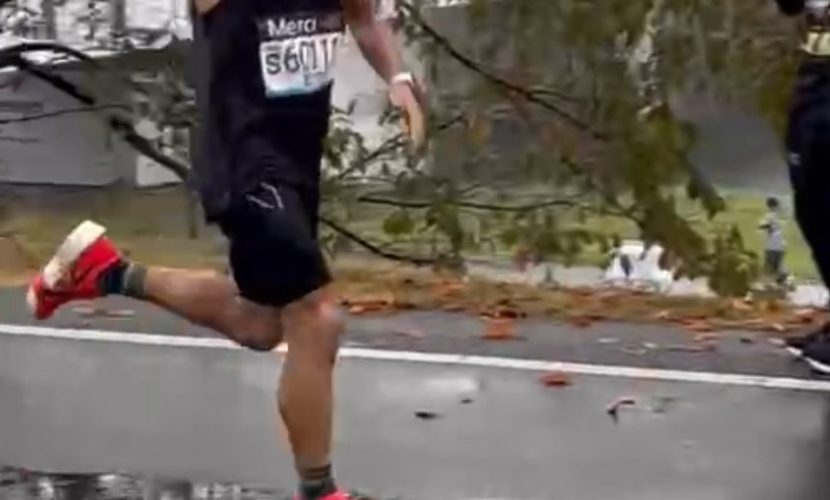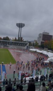 岡山マラソンの当日は、朝から雨。